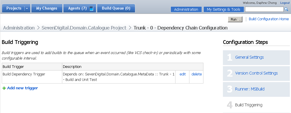 We’ve placed the set of in-house domain projects in a linear build order.  Each project in the list is configured to trigger the next in line when it successfully builds, using the TeamCity “Dependencies” tab. If somone makes a change to a domain project, TeamCity will pick up the commit, build the project and run its tests, and this will kick off the rest of the chain underneath. In the screenshot examples below, I’ve used a portion of our domain chain where SevenDigital.Domain.Catalogue is dependent on SevenDigital.Domain.Catalogue.MetaData.